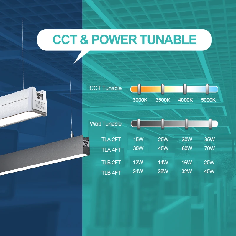 مع إعدادات قوة كهربائية قابلة للتعديل، يمكنك تخصيص سطوع الضوء وفقًا لاحتياجاتك. سواء كنت تفضل ضوءًا أخف وأكثر جوًا لبيئة استرخاء أو ضوءًا أكثر سطوعًا وتركيزًا للمهام التي تتطلب الدقة، فإن ضوء السقف الخطي المكتبي القابل للتغيير في درجة الحرارة اللونية (CCT) والقوة الكهربائية من نونلايت يلبي احتياجاتك.